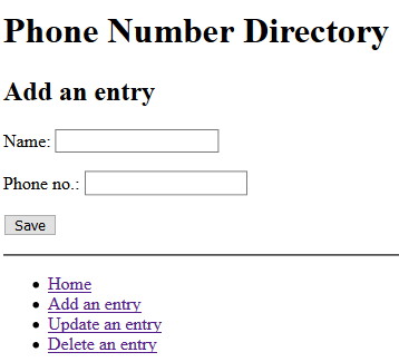 Exercise: Copy and paste the HTML code, including the script element with its JavaScript code, into a fresh editor window. Don't forget to insert the content of the nav element from the previous subsection. Then save the content of the editor window in your example folder as "add.html". Then open the "add.html" file in a browser. You should see a page containing a user interface as in Figure 2-1 below. Add a name and a phone number and click the Save button. Then click on Home in the menu for checking if your new key-value pair has been added to the store.