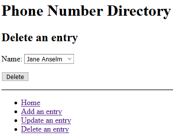 Exercise: Copy and paste the HTML code into a fresh editor window. Don't forget to insert both the content of the nav element (from a code listing above) and the content of the script element. Save the resulting user interface page in your example folder as "delete.html". Then open the "delete.html" file in a browser. You should see a page containing a user interface as in Figure 2-2 below. Choose a name and click the Delete button. Then click on Home in the menu for checking if the chosen key-value pair has been deleted from the store.