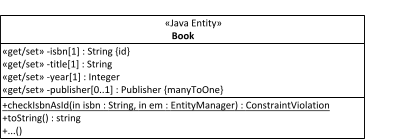 In a Java Entity class model, for any association end dot in the OO class model, we show the reference property representing the association end and annotate it with the functionality type of the unidirectional association represented by it. In our example, we add a reference property publisher in the entity class Book and annotate it with the association's functionality type manyToOne: