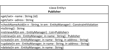 As explained before, we obtain the Java Entity class Publisher from the corresponding OO design class by (1) making all properties private, (2) using Java datatype classes (String, Integer, etc.), (3) adding the stereotype «get/set» to properties (specifying public getters and setters), (4) adding a toString function, (5) adding the (class-level) data storage methods create, retrieve, update and delete: