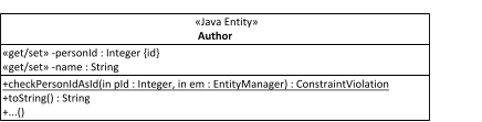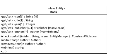 In the Java Entity class model, any reference property specified in the OO class model is annotated with the functionality type of the association represented by it. In our example, we annotate the reference property authors in the Entity class Book with manyToMany: