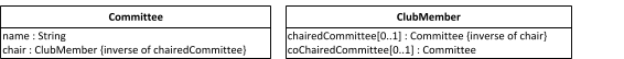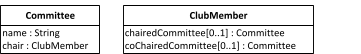 For being able to easily retrieve the committees that are chaired or co-chaired by a club member, we add two reference properties to our Committee-ClubMember example model: the property of a club member to be the chair of a committee (ClubMember::chairedCommittee) and the property of a club member to be the co-chair of a committee (ClubMember::coChairedCommittee). We assume that any club member may chair or co-chair at most one committee (where the disjunction is non-exclusive). So, we get the following model: