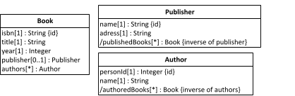 Notice that the model contains two derived inverse reference properties: Publisher::/publishedBooks and Author::/authoredBooks. Each of them is linked to a master property, from which it is derived. Consequently, each of them represents a pair of mutually inverse reference properties corresponding to a bidirectional association.