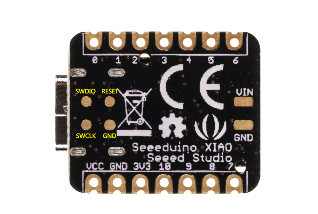 The XIAO Board uses the XC6206. According to the datasheet of this voltage regulator, the maximum input voltage is 6V, so this will also be the maximum voltage that it can be supplied to the board either via the contact pads located on the back of the board (see Figure 3) or via the USB-C connector (which normally shall provide about 5V). It can output a maximum of 200mA of current, but we do not recommend more than 150mA to avoid overheating it. Moreover, keep in mind that up to about 25mA may be used by the MCU and the other components (LEDs, voltage regulator, etc), so the conservative current available for the user, to power sensors and any other devices is about 120mA. Moreover, keep in mind that the GPIO pins can only supply a little amount of current. According with the specs, this can go up to 7mA (source) or 10mA (sink) per pin, but for this a special bit/flag shall be enabled, and this also comes with some other disadvantages. The real "by default" current for each GPIO pin is 2.5mA (sink) or 2mA (source) per pin.
